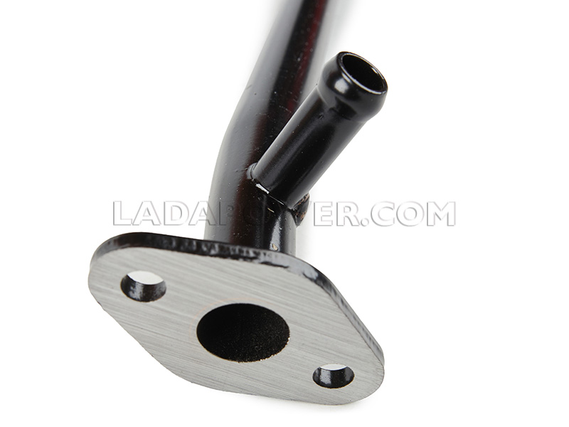 It has an additional small pipe that connects it with the carburetor or intake manifold or water pump connection (red arrow on the photo) closer to the water pump.